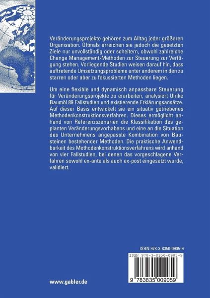 Um eine flexible und dynamisch anpassbare Steuerung für Veränderungsprojekte zu erarbeiten, analysiert Ulrike Baumöl 89 Fallstudien sowie existierende Erklärungsansätze. Auf dieser Basis entwickelt sie ein situativ getriebenes Methodenkonstruktionsverfahren. Dieses ermöglicht anhand von Referenzszenarien die Klassifikation des geplanten Veränderungsvorhabens und eine an die Situation des Unternehmens angepasste Kombination von Bausteinen bestehender Methoden. Die praktische Anwendbarkeit des Methodenkonstruktionsverfahrens wird anhand von vier Fallstudien, bei denen das vorgeschlagene Verfahren sowohl ex-ante als auch ex-post eingesetzt wurde, validiert.