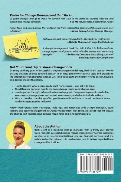 Not Your Usual Dry Business Change Book Drawing on 30-years of successful change management delivery, this book lays out how to get any business change adopted. Written in an engaging conversational style and brought to life through cartoon character 'Change Cat,' Change Management that Sticks gets to the heart of how to design, develop, and deliver change that works.How to identify what people really want from change-and sell it to them The difference between how to motivate change leaders and change users How to gather the right information to develop great change management stakeholder assessments, change plans, and impact assessments and what to include in them What to do when the change effort gets into trouble and how to remain authentic when hard messages must be delivered A great tool for change managers, team leaders, and senior management author Barb Grant shares the strategies, tools, tips, and templates to ensure the change isn't just done but delivers meaningful and long-lasting results.