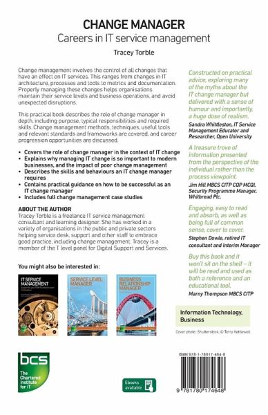 Change management is about the control of all changes that have an effect on the IT services and hence, the business of an organisation. This practical book describes the change manager role in depth including purpose, required skills and career progression. It also covers relevant tools, standards and frameworks.