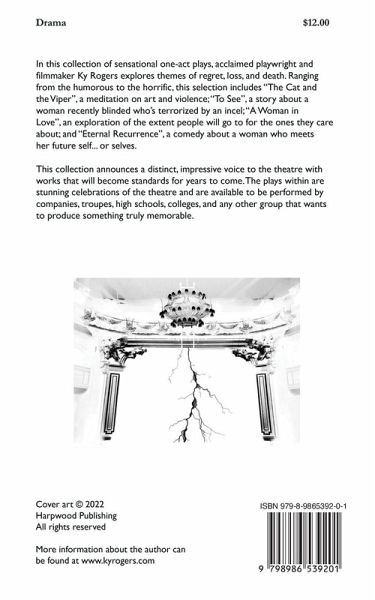 In this collection of sensational one-act plays, acclaimed playwright and filmmaker Ky Rogers explores themes of regret, loss, and death. Ranging from the humorous to the horrific, the selections include "The Cat and the Viper", a meditation on art and violence; "To See", a story about a woman recently blinded who's terrorized by an incel; "A Woman in Love", an exploration of the extent people will go for the ones they care about; and "Eternal Recurrence", a comedy about a woman who meets her future self... or selves. This collection announces a distinct, impressive voice to the theatre with works that will become standards for years to come. The plays within are stunning celebrations of the theatre and are available to be performed by companies, troupes, high schools, colleges, and any other group that wants to produce something truly memorable.