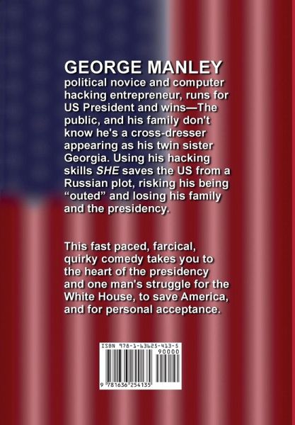 GEORGE MANLEY political novice and computer hacking entrepreneur, runs for US President and wins-The public, and his family don't know he's a cross-dresser appearing as his twin sister "Georgia." Using his hacking skills SHE saves the US from a Russian plot, risking his being "outed" and losing his family and the Presidency. This fast paced, farcical, quirky comedy takes you to the heart of the presidency and one man's struggle for the White House, to save America, and for personal acceptance.