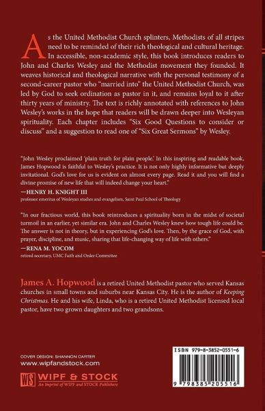 As the United Methodist Church splinters, Methodists of all stripes need to be reminded of their rich theological and cultural heritage. In accessible, non-academic style, this book introduces readers to John and Charles Wesley and the Methodist movement they founded. It weaves historical and theological narrative with the personal testimony of a second-career pastor who ""married into"" the United Methodist Church, was led by God to seek ordination as pastor in it, and remains loyal to it after thirty years of ministry. The text is richly annotated with references to John Wesley's works in the hope that readers will be drawn deeper into Wesleyan spirituality. Each chapter includes ""Six Good Questions to consider or discuss"" and a suggestion to read one of ""Six Great Sermons"" by Wesley.