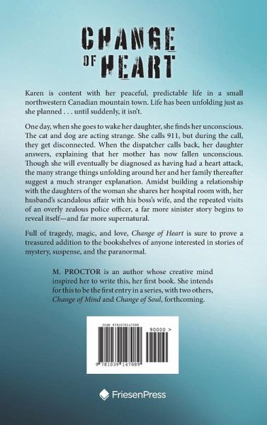 Karen is content with her peaceful, predictable life in a small northwestern Canadian mountain town. Life has been unfolding just as she planned . . . until suddenly, it isn't. One day, when she goes to wake her daughter, she finds her unconscious. The cat and dog are acting strange. She calls 911, but during the call, they get disconnected. When the dispatcher calls back, her daughter answers, explaining that her mother has now fallen unconscious. Though she will eventually be diagnosed as having had a heart attack, the many strange things unfolding around her and her family thereafter suggest a much stranger explanation. Amidst building a relationship with the daughters of the woman she shares her hospital room with, her husband's scandalous affair with his boss's wife, and the repeated visits of an overly zealous police officer, a far more sinister story begins to reveal itself-and far more supernatural. Full of tragedy, magic, and love, Change of Heart is sure to prove a treasured addition to the bookshelves of anyone interested in stories of mystery, suspense, and the paranormal.