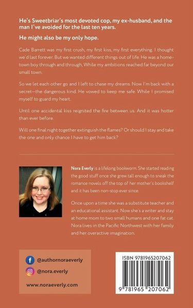 He's Sweetbriar's most devoted cop, my ex-husband, and the man I've avoided for the last ten years. He might also be my only hope. Cade Barrett was my first crush, my first kiss, my first everything. I thought we'd last forever. But we wanted different things out of life. He was a hometown boy through and through, While my ambitions reached far beyond our small town. So we let each other go and I left to chase my dreams. Now I'm back with a secret-the dangerous kind. He vowed to keep me safe. While I promised myself to guard my heart. Until one accidental kiss reignited the fire between us. And it was hotter than ever before. Will one final night together extinguish the flames? Or should I stay and take the one and only chance I have to get him back?