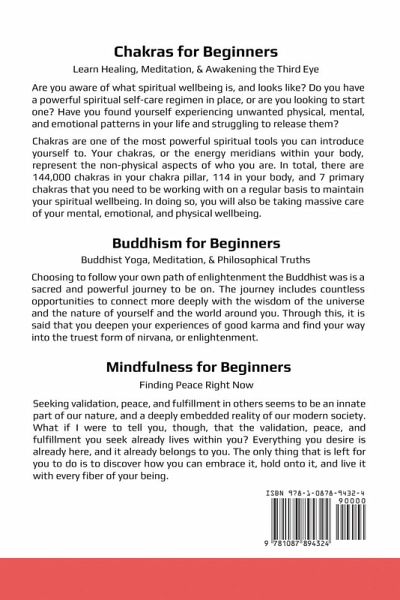 Chakras for Beginners Learn Healing, Meditation, & Awakening the Third Eye Are you aware of what spiritual wellbeing is, and looks like? Do you have a powerful spiritual self-care regimen in place, or are you looking to start one? Have you found yourself experiencing unwanted physical, mental, and emotional patterns in your life and struggling to release them? Chakras are one of the most powerful spiritual tools you can introduce yourself to. Your chakras, or the energy meridians within your body, represent the non-physical aspects of who you are. In total, there are 144,000 chakras in your chakra pillar, 114 in your body, and 7 primary chakras that you need to be working with on a regular basis to maintain your spiritual wellbeing. In doing so, you will also be taking massive care of your mental, emotional, and physical wellbeing. Buddhism for Beginners Buddhist Yoga, Meditation, & Philosophical Truths Choosing to follow your own path of enlightenment the Buddhist was is a sacred and powerful journey to be on. The journey includes countless opportunities to connect more deeply with the wisdom of the universe and the nature of yourself and the world around you. Through this, it is said that you deepen your experiences of good karma and find your way into the truest form of nirvana, or enlightenment. Mindfulness for Beginners Finding Peace Right Now Seeking validation, peace, and fulfillment in others seems to be an innate part of our nature, and a deeply embedded reality of our modern society. What if I were to tell you, though, that the validation, peace, and fulfillment you seek already lives within you? Everything you desire is already here, and it already belongs to you. The only thing that is left for you to do is to discover how you can embrace it, hold onto it, and live it with every fiber of your being.