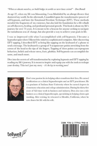 "When we educate ourselves, we build bridges to worlds we never knew existed" - Don Brandt At age 27, when my life was blossoming, I was blindsided by an abrupt divorce that shattered my world. In the aftermath, I stumbled upon the transformative powers of self-hypnosis, and later the Emotional Freedom Technique (EFT). These methods mended the fragments of my existence, but also laid the foundation for a life rebuilt on self-discovery, healing, and profound personal growth. This book is about my life's journey for over 75 years. It is meant to be a beacon for anyone seeking to navigate the tumultuous seas of change, but also provide a way to achieve your goals in life. I was so impressed with what I accomplished with self-hypnosis; I became a hypnotherapist where I likened the mind to a sophisticated computer. After discovering EFT tapping, I described EFT as being like tapping on the keyboard of a phone to send a message. The keyboard is a group of 9 acupuncture points stretching from the crown of the head to the tips of the fingers. Tapping of these points can reprogram behaviors, beliefs and release stress, fears, phobias. Self-hypnosis can accomplish the same, and much more. Dive into the secrets of self-transformation by exploring hypnosis and EFT tapping by reading my life's journey. It is meant to inspire and equip you with the tools to reshape your destiny. This isn't just my story - it's the key to rewriting yours!