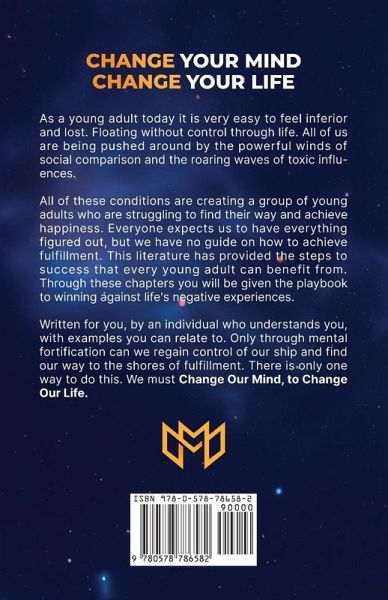 As a young adult today it is very easy to feel inferior and lost. Floating without control through life. All of us are being pushed around by the powerful winds of social comparison and the roaring waves of toxic influences. All of these conditions are creating a group of young adults who are struggling to find their way and achieve happiness. Everyone expects us to have everything figured out, but we have no guide on how to achieve fulfillment. This literature has provided the steps to success that every young adult can benefit from. Through these chapters you will be given the playbook to winning against life's negative experiences. Written for you, by an individual who understands you, with examples you can relate to. Only through mental fortification can we regain control of our ship and find our way to the shores of fulfillment. There is only one way to do this. We must Change Our Mind, to Change Our Life.