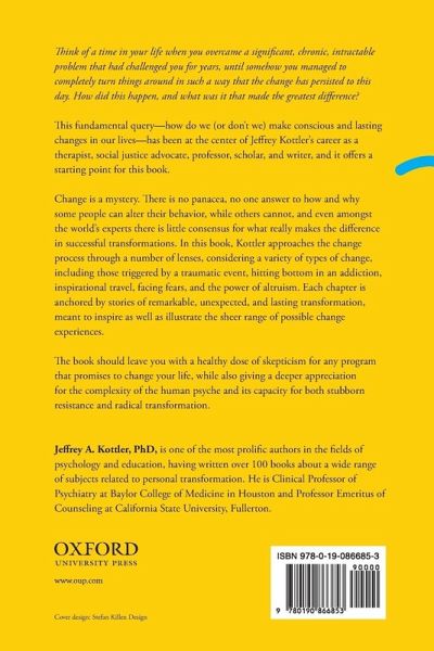 Change is often a mystery, one that baffles doctors, therapists, teachers, coaches, parents--and especially those of us who struggle to alter our own bad habits or make lasting improvements in our lives. Why do we suddenly change for the better after years of failed efforts? Why do some of us never escape our self-destructive behaviors, even when we desperately want to? What is it that most reliably and effectively produces growth, learning, and development that persist over time? In this vividly written volume, psychotherapist Jeffrey Kottler weaves together inspiring stories and the latest research, taking the reader on a fascinating exploration of human behavior while highlighting what does--and does not--lead to lasting change. Kottler illuminates our many efforts to change--to stop taking drugs, reduce dependencies, leave a destructive relationship, find new and more meaningful work, or adjust to a devastating accident or trauma. Readers are invited to explore key triggers such as hitting bottom, moments of clarity, the power of altruism and service, travel to new surroundings, reading or listening to stories, religious conversion, and much more. Kottler also explores why most changes don't last and what we can do to prevent relapses. Throughout the book, Kottler recounts stories of colleagues and patients--and even recalls episodes from his own life-often moving tales of remarkable, unexpected, and lasting transformation. He looks, for instance, at a young black basketball star, confined to a wheelchair for life after being shot four times, who turned his life around, becoming a scholar and a PhD. An intriguing glimpse into the complexity of the human psyche, Change will engage anyone who has ever struggled to alter a habit, enrich relationships, recover from disappointment or failure, strive for more meaningful and productive work, deal with anxiety, loneliness, fears, stress, and depression, or transform their lives in any kind of significant way.