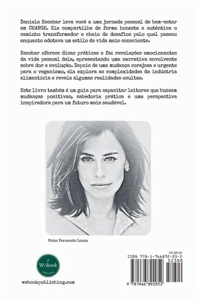 Daniela Escobar takes you on a personal wellness journey in CHANGE, candidly sharing her transformative path through challenges and growth while embracing a mindful lifestyle. As a Brazilian celebrity, Escobar offers readers practical insights and heartfelt revelations from her private life, providing a compelling narrative of personal pain and growth. With a courageous and urgent shift towards veganism, she navigates the complexities of the food industry, shedding light on its hidden realities. This book also serves as a guide to empower readers seeking positive change, practical wisdom, and an inspiring perspective for a healthier future. - Daniela Escobar leva você a uma jornada pessoal de bem-estar em CHANGE. Ela compartilha de forma honesta e autêntica o caminho transformador e cheio de desafios pelo qual passou enquanto adotava um estilo de vida mais consciente. Escobar oferece aos leitores insights práticos e revelações emocionantes da vida pessoal dela, apresentando uma narrativa envolvente sobre dor e evolução. Depois de uma mudança corajosa e urgente para o veganismo, ela explora as complexidades da indústria alimentícia e revela algumas realidades ocultas. Este livro também pode ser um guia para capacitar leitores que buscam mudanças positivas, sabedoria prática e uma perspectiva inspiradora para um futuro mais saudável.