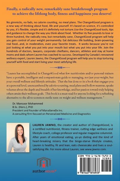 Finally, a radically new, remarkably sane breakthrough program to achieve the lifelong body, fitness and happiness you deserve! No gimmicks, no fads, no calorie counting, no meal plans. The Change4Good program is a new way of thinking about food, life and yourself. It's based on science, it's controlled by you, it's flexible, simple and it's definitely not torture. Use the Change4Good tools, tips and guidance to change the way you think about food. Whether its five pounds to lose or three hundred, the radically new, but remarkably sane, Change4Good program will help you gain control of your weight permanently. Eat delicious life building, brain-powering real food...and, in moderation, even your favorite treats. It works because you're not just looking at what you put into your mouth but what you put into your life. Join the hundreds of doctors, lawyers, corporate chieftains, dancers, athletes and stay at home moms and dads whom Lauren has coached to success. Developed by Canada's renowned wellness expert, Lauren Jawno, the Change4Good program will help you to stop torturing yourself with food and start living your most satisfying life. "Lauren has accomplished in Change4Good what few nutritionists and/or personal trainers have: a portable, intelligent and compassionate guide to managing, not just your weight, but your overall wellness and lifestyle attitudes. That she has done so in a book that engages you at a personal level, unencumbered by calorie-counting, meal plans and hollow mantras, speaks volumes about the depth and breadth of her knowledge, and her passion toward truly helping others attain their wellness goals. This book is a must read for anyone looking for a refreshing alternative to the all-to-common sterile texts on weight and wellness management." Dr. Mansoor Mohammed B.Sc. (Hons.), PhD President and Founder of ManaGeneDx Inc., A consulting firm focused on Personalized Medicine and Diagnostics