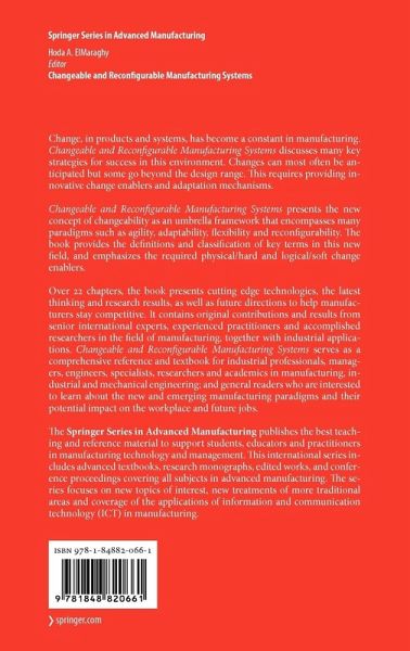 Definitions and Strategies.- Changeability - An Introduction.- Changing and Evolving Products and Systems - Models and Enablers.- Focused Flexibility in Production Systems.- Physical Enablers - Manufacturing Machinery and Hardware.- Control of Reconfigurable Machine Tools.- Reconfigurable Machine Tools for a Flexible Manufacturing System.- Reconfigurable Machine Tools and Equipment.- Changeable and Reconfigurable Assembly Systems.- Logical Enablers - Reconfigurable Control Systems for Robots.- Unified Dynamic and Control Models for Reconfigurable Robots.- Reconfigurable Control of Constrained Flexible Joint Robots Interacting with Dynamic and Changeable Environment.- Logical Enablers - Process Planning.- Reconfiguring Process Plans: A New Approach to Minimize Change.- Logical Enablers - Production and Capacity Planning and Control.- Adaptive Production Planning and Control - Elements and Enablers of Changeability.- Component Oriented Design of Change-Ready MPC Systems.- Dynamic Capacity Planning and Modeling Its Complexity.- Managing and Justifying Change in Manufacturing - Products and Systems Design, Planning and Management.- Design for Changeability.- Changeability Effect on Manufacturing Systems Design.- Managing Change and Reconfigurations of CNC Machine Tools.- Managing and Justifying Change in Manufacturing - Cost and Quality Management.- Economic and Strategic Justification of Changeable, Reconfigurable and Flexible Manufacturing.- Quality and Maintainability Frameworks for Changeable and Reconfigurable Manufacturing.- Maintenance Strategies for Changeable Manufacturing.- Future Directions.- The Cognitive Factory.- Migration Manufacturing - A New Concept for Automotive Body Production.- Changeable Factory Buildings - An Architectural View.