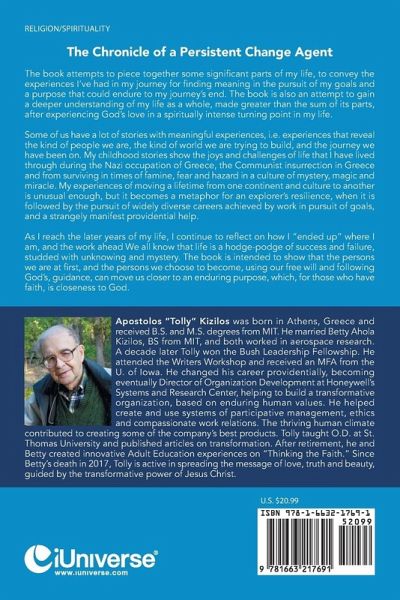A Chronicle of a Persistent Change Agent The book attempts to piece together some significant parts of my life, to convey the experiences I've had in my journey for finding meaning in the pursuit of my goals and a purpose that could endure to my journey's end. The book is also an attempt to gain a deeper understanding of my life as a whole, made greater than the sum of its parts, after experiencing God's love in a spiritually intense turning point in my life. Some of us have a lot of stories with meaningful experiences, i.e. experiences that reveal the kind of people we are, the kind of world we are trying to build, and the journey we have been on. My childhood stories show the joys and challenges of life that I have lived through during the Nazi occupation of Greece, the Communist insurrection in Greece and from surviving in times of famine, fear and hazard in a culture of mystery, magic and miracle. My experiences of moving a lifetime from one continent and culture to another is unusual enough, but it becomes a metaphor for an explorer's resilience, when it is followed by the pursuit of widely diverse careers achieved by work in pursuit of goals, and a strangely manifest providential help. As I reach the later years of my life, I continue to reflect on how I "ended up" where I am, and the work ahead We all know that life is a hodge-podge of success and failure, studded with unknowing and mystery. The book is intended to show that the persons we are at first, and the persons we choose to become, using our free will and following God's, guidance, can move us closer to an enduring purpose, which, for those who have faith, is closeness to God.