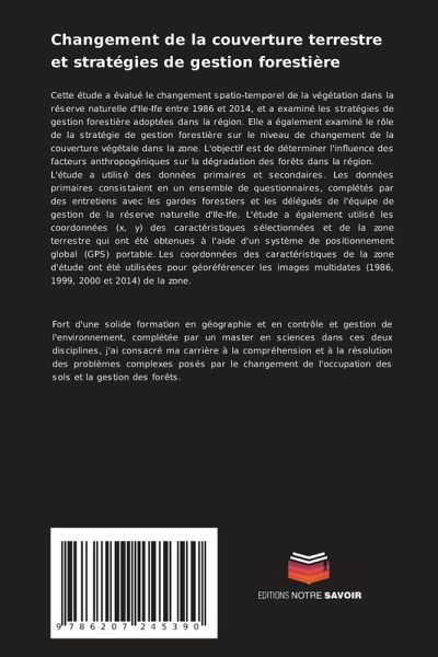 Cette étude a évalué le changement spatio-temporel de la végétation dans la réserve naturelle d'Ile-Ife entre 1986 et 2014, et a examiné les stratégies de gestion forestière adoptées dans la région. Elle a également examiné le rôle de la stratégie de gestion forestière sur le niveau de changement de la couverture végétale dans la zone. L'objectif est de déterminer l'influence des facteurs anthropogéniques sur la dégradation des forêts dans la région.L'étude a utilisé des données primaires et secondaires. Les données primaires consistaient en un ensemble de questionnaires, complétés par des entretiens avec les gardes forestiers et les délégués de l'équipe de gestion de la réserve naturelle d'Ile-Ife. L'étude a également utilisé les coordonnées (x, y) des caractéristiques sélectionnées et de la zone terrestre qui ont été obtenues à l'aide d'un système de positionnement global (GPS) portable. Les coordonnées des caractéristiques de la zone d'étude ont été utilisées pour géoréférencer les images multidates (1986, 1999, 2000 et 2014) de la zone.