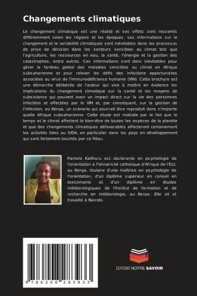 Le changement climatique est une réalité et ses effets sont ressentis différemment selon les régions et les époques. Les informations sur le changement et la variabilité climatiques sont inévitables dans les processus de prise de décision dans les secteurs sensibles au climat tels que l'agriculture, les ressources en eau, la santé, l'énergie et la gestion des catastrophes, entre autres. Ces informations sont donc inévitables pour gérer le fardeau global des maladies sensibles au climat en Afrique subsaharienne et pour relever les défis des infections opportunistes associées au virus de l'immunodéficience humaine (VIH). Cette brochure est une démarche délibérée de l'auteur qui vise à mettre en évidence les implications du changement climatique sur la santé et les moyens de subsistance qui peuvent avoir un impact direct sur la vie des personnes infectées et affectées par le VIH et, par conséquent, sur la gestion de l'infection, au Kenya, un scénario qui pourrait être reproduit dans n'importe quelle Afrique subsaharienne. Cette étude est motivée par le fait que le temps et le climat affectent le bien-être de toutes les espèces de la planète et que des changements climatiques défavorables affecteront certainement les activités liées au SIDA, en particulier dans les pays en développement qui sont fortement touchés par ce fléau.