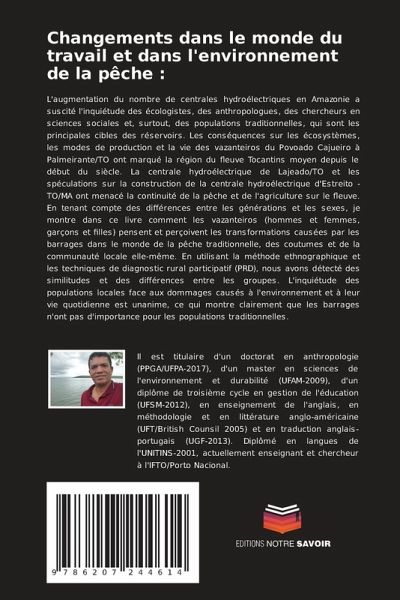 L'augmentation du nombre de centrales hydroélectriques en Amazonie a suscité l'inquiétude des écologistes, des anthropologues, des chercheurs en sciences sociales et, surtout, des populations traditionnelles, qui sont les principales cibles des réservoirs. Les conséquences sur les écosystèmes, les modes de production et la vie des vazanteiros du Povoado Cajueiro à Palmeirante/TO ont marqué la région du fleuve Tocantins moyen depuis le début du siècle. La centrale hydroélectrique de Lajeado/TO et les spéculations sur la construction de la centrale hydroélectrique d'Estreito -TO/MA ont menacé la continuité de la pêche et de l'agriculture sur le fleuve. En tenant compte des différences entre les générations et les sexes, je montre dans ce livre comment les vazanteiros (hommes et femmes, garçons et filles) pensent et perçoivent les transformations causées par les barrages dans le monde de la pêche traditionnelle, des coutumes et de la communauté locale elle-même. En utilisant la méthode ethnographique et les techniques de diagnostic rural participatif (PRD), nous avons détecté des similitudes et des différences entre les groupes. L'inquiétude des populations locales face aux dommages causés à l'environnement et à leur vie quotidienne est unanime, ce qui montre clairement que les barrages n'ont pas d'importance pour les populations traditionnelles.