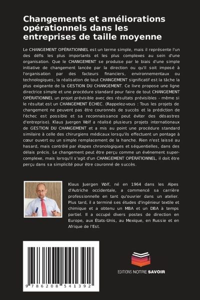 Le CHANGEMENT OPÉRATIONNEL est un terme simple, mais il représente l'un des défis les plus importants et les plus complexes au sein d'une organisation. Que le CHANGEMENT se produise par le biais d'une simple initiative de changement lancée par la direction ou qu'il soit imposé à l'organisation par des facteurs financiers, environnementaux ou technologiques, la réalisation de tout CHANGEMENT significatif est la tâche la plus exigeante de la GESTION DU CHANGEMENT. Ce livre propose une ligne directrice simple et une procédure standard pour faire de tout CHANGEMENT OPÉRATIONNEL un projet prévisible avec des résultats prévisibles - même si le résultat est un CHANGEMENT ÉCHEC. (Rappelez-vous : Tous les projets de changement ne peuvent pas être couronnés de succès et la prédiction de l'échec est possible et sa reconnaissance peut éviter des désastres d'entreprise). Klaus Juergen Wolf a réalisé plusieurs projets internationaux de GESTION DU CHANGEMENT et a mis au point une procédure standard similaire à celle des chirurgiens médicaux lorsqu'ils effectuent un pontage à coeur ouvert ou un simple remplacement de la hanche. Rien n'est laissé au hasard, mais contrôlé par étapes chronologiques et séquentielles, dans des délais précis. Le changement peut être perçu comme un événement super-complexe, mais lorsqu'il s'agit d'un CHANGEMENT OPÉRATIONNEL, il doit être perçu dans sa simplicité pour être couronné de succès.