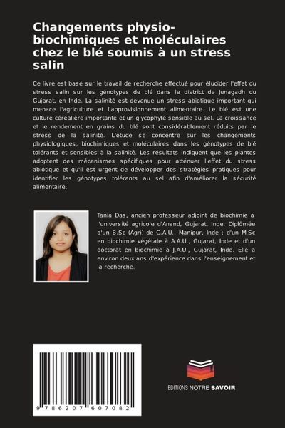 Ce livre est basé sur le travail de recherche effectué pour élucider l'effet du stress salin sur les génotypes de blé dans le district de Junagadh du Gujarat, en Inde. La salinité est devenue un stress abiotique important qui menace l'agriculture et l'approvisionnement alimentaire. Le blé est une culture céréalière importante et un glycophyte sensible au sel. La croissance et le rendement en grains du blé sont considérablement réduits par le stress de la salinité. L'étude se concentre sur les changements physiologiques, biochimiques et moléculaires dans les génotypes de blé tolérants et sensibles à la salinité. Les résultats indiquent que les plantes adoptent des mécanismes spécifiques pour atténuer l'effet du stress abiotique et qu'il est urgent de développer des stratégies pratiques pour identifier les génotypes tolérants au sel afin d'améliorer la sécurité alimentaire.