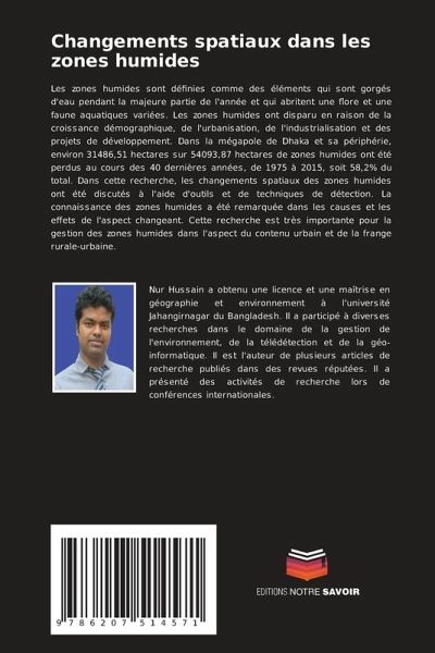 Les zones humides sont définies comme des éléments qui sont gorgés d'eau pendant la majeure partie de l'année et qui abritent une flore et une faune aquatiques variées. Les zones humides ont disparu en raison de la croissance démographique, de l'urbanisation, de l'industrialisation et des projets de développement. Dans la mégapole de Dhaka et sa périphérie, environ 31486,51 hectares sur 54093,87 hectares de zones humides ont été perdus au cours des 40 dernières années, de 1975 à 2015, soit 58,2% du total. Dans cette recherche, les changements spatiaux des zones humides ont été discutés à l'aide d'outils et de techniques de détection. La connaissance des zones humides a été remarquée dans les causes et les effets de l'aspect changeant. Cette recherche est très importante pour la gestion des zones humides dans l'aspect du contenu urbain et de la frange rurale-urbaine.