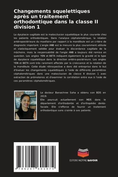 La dysplasie sagittale est la malocclusion squelettique la plus courante chez les patients orthodontiques. Dans l'analyse céphalométrique, la relation antéropostérieure du maxillaire par rapport à la mandibule est un critère de diagnostic important. L'angle ANB est la mesure la plus couramment utilisée et statistiquement validée pour évaluer la discordance sagittale de la mâchoire, mais la responsabilité de l'angle ANB a toujours été remise en question. Les angles YEN et BETA indiquent également la gravité et le type de dysplasie squelettique dans la direction antéro-postérieure. Les angles YEN et BETA sont très rarement affectés par la croissance et la rotation de la mandibule. Cette étude rétrospective a donc été entreprise dans le but d'évaluer les changements squelettiques à l'aide de différents paramètres céphalométriques dans une malocclusion de classe II division 1 avec extraction de prémolaires et d'examiner la corrélation entre eux à l'aide de ces paramètres céphalométriques.