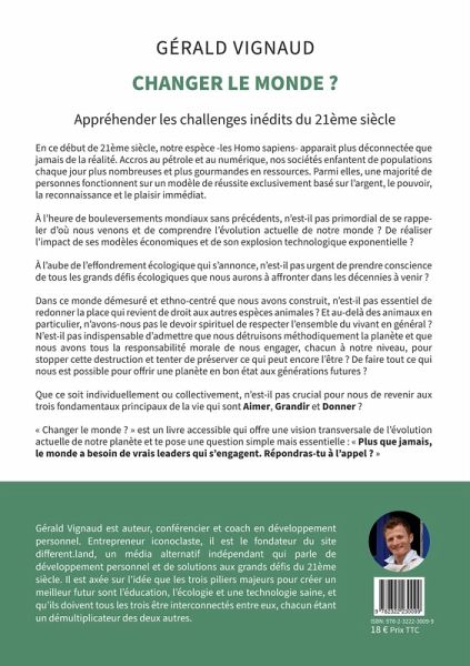 En ce début de 21ème siècle, notre espèce -les Homo sapiens- apparait plus déconnectée que jamais de la réalité. Accros au pétrole et au numérique, nos sociétés enfantent de populations chaque jour plus nombreuses et plus gourmandes en ressources. Parmi elles, une majorité de personnes fonctionnent sur un modèle de réussite exclusivement basé sur l'argent, le pouvoir, la reconnaissance et le plaisir immédiat.À l'heure de bouleversements mondiaux sans précédents, n'est-il pas primordial de se rappeler d'où nous venons et de comprendre l'évolution actuelle de notre monde ? De réaliser l'impact de ses modèles économiques et de son explosion technologique exponentielle ?À l'aube de l'effondrement écologique qui s'annonce, n'est-il pas urgent de prendre conscience de tous les grands défis écologiques que nous aurons à affronter dans les décennies à venir ?Dans ce monde démesuré et ethno-centré que nous avons construit, n'est-il pas essentiel de redonner la place qui revient de droit aux autres espèces animales ? Et au-delà des animaux en particulier, n'avons-nous pas le devoir spirituel de respecter l'ensemble du vivant en général ? N'est-il pas indispensable d'admettre que nous détruisons méthodiquement la planète et que nous avons tous la responsabilité morale de nous engager, chacun à notre niveau, pour stopper cette destruction et tenter de préserver ce qui peut encore l'être ? De faire tout ce qui nous est possible pour offrir une planète en bon état aux générations futures ?Que ce soit individuellement ou collectivement, n'est-il pas crucial pour nous de revenir aux trois fondamentaux principaux de la vie qui sont Aimer, Donner et Grandir ?« Changer le monde ? » est un livre accessible qui offre une vision transversale de l'évolution actuelle de notre planète et te pose une question simple mais essentielle : « Plus que jamais, le monde a besoin de vrais leaders qui s'engagent. Répondras-tu à l'appel ? »