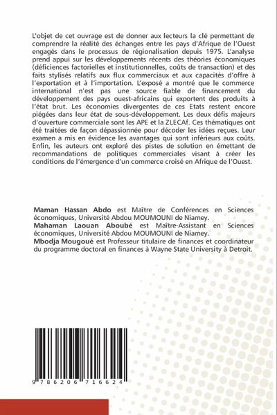 L'objet de cet ouvrage est de donner aux lecteurs la clé permettant de comprendre la réalité des échanges entre les pays d'Afrique de l'Ouest engagés dans le processus de régionalisation depuis 1975. L'analyse prend appui sur les développements récents des théories économiques (déficiences factorielles et institutionnelles, coûts de transaction) et des faits stylisés relatifs aux flux commerciaux et aux capacités d'offre à l'exportation et à l'importation. L'exposé a montré que le commerce international n'est pas une source fiable de financement du développement des pays ouest-africains qui exportent des produits à l'état brut. Les économies divergentes de ces Etats restent encore piégées dans leur état de sous-développement. Les deux défis majeurs d'ouverture commerciale sont les APE et la ZLECAf. Ces thématiques ont été traitées de façon dépassionnée pour décoder les idées reçues. Leur examen a mis en évidence les avantages qui sont inférieurs aux coûts. Enfin, les auteurs ont exploré des pistes de solution en émettant de recommandations de politiques commerciales visant à créer les conditions de l'émergence d'un commerce croisé en Afrique de l'Ouest.