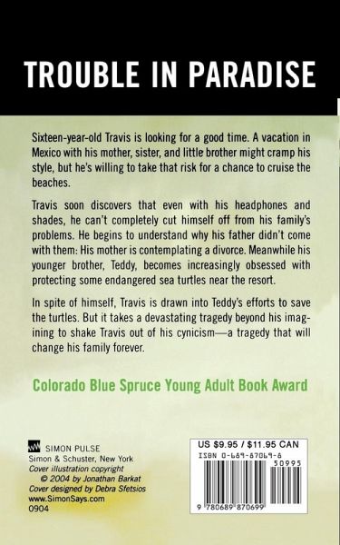 Trouble In Paradise Sixteen-year-old Travis is looking for a good time. A vacation in Mexico with his mother, sister, and little brother might cramp his style, but he's willing to take that risk for a chance to cruise the beaches. Travis soon discovers that even with his headphones and shades, he can't completely cut himself off from his family's problems. He begins to understand why his father didn't come with them: His mother is contemplating a divorce. Meanwhile his younger brother, Teddy, becomes increasingly obsessed with protecting some endangered sea turtles near the resort. In spite of himself, Travis is drawn into Teddy's efforts to save the turtles. But it takes a devastating tragedy beyond his imagining to shake Travis out of his cynicism -- a tragedy that will change his family forever.