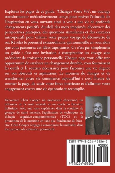 Bienvenue dans le monde de "Changez Votre Vie" !Plongez dans une expérience captivante de 318 pages qui promet de transformer votre existence. Ce guide soigneusement élaboré est bien plus qu'un simple livre ; c'est une porte ouverte vers un avenir rempli de possibilités et de changements positifs. Parcourez ses pages avec curiosité et anticipation, et découvrez des perspectives inspirantes, des conseils pratiques et des exercices stimulants conçus pour réveiller votre potentiel dormant. Chaque page de ce livre est une invitation à l'introspection, à la découverte de soi et à la croissance personnelle. Vous y trouverez les outils nécessaires pour façonner une vie qui résonne avec vos aspirations les plus profondes. Osez entreprendre ce voyage unique vers une transformation significative et durable. Aujourd'hui marque le début de votre voyage vers une vie plus épanouie et gratifiante. Ne laissez pas passer cette opportunité de saisir votre destin entre vos mains. Rejoignez-nous dans cette aventure inspirante et laissez "Changez Votre Vie" être votre guide vers une nouvelle réalité. Prêt à vous embarquer dans cette aventure extraordinaire ?