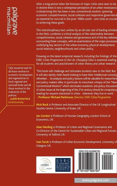 A new conventional wisdom, spanning academic and policy communities, sees a combination of economic competitiveness, social cohesion and responsive governance as essential for survival in the post-1980s world - and cities as crucial to achieving these goals. This interdisciplinary text provides the first critical examination of these ideas, drawing on the UK Cities research programme and other recent research. It combines analysis of the competitiveness-cohesion-governance problematic with examination of the major processes underlying key sectors of the urban economy, physical development, social relations, neighbourhoods and urban policy.