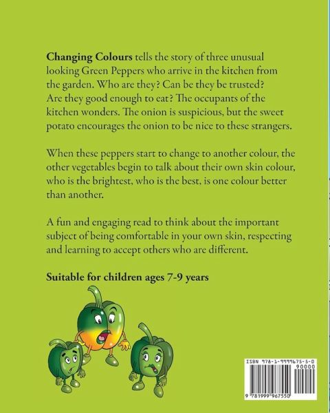 Changing Colours tells the story of three unusual looking Green Peppers who arrive in the kitchen from the garden. Who are they? Can be they be trusted? Are they good enough to eat? The occupants of the kitchen wonders. The onion is suspicious, but the sweet potato encourages the onion to be nice to these strangers. When these peppers start to change to another colour, the other vegetables begin to talk about their own skin colour, who is the brightest, who is the best, is one colour better than another. This is a fun and engaging read to think about the important subject of being comfortable in your own skin, respecting and learning to accept others who are different.