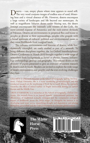 Deserts - vast, empty places where time appears to stand still. The very word conjures images of endless seas of sand, blistering heat and a virtual absence of life. However, deserts encompass a large variety of landscapes and life beyond our stereotypes. As well as magnificent Saharan dunes under blazing sun, the desert concept encompasses the intensely cold winters of the Gobi, the snow- covered expanse of Antarctica and the rock- strewn drylands of Pakistan. Deserts are environments in perpetual flux and home to peoples as diverse as their surroundings, peoples who grapple with a broad spectrum of cultural, political and environmental issues as they wrest livelihoods from marginal lands. The cultures, environments and histories of deserts, while fundamentally entangled, are rarely studied as part of a network. To bring different disciplines together, the 1st Oxford Interdisciplinary Deserts Conference in March 2010 brought together a wide range of researchers from backgrounds as varied as physics, history, archaeology anthropology, geology and geography. This volume draws on the diversity of papers presented to give an overview of current research in deserts and drylands. Readers are invited to explore the wide range of desert environments and peoples and the ever-evolving challenges they face.