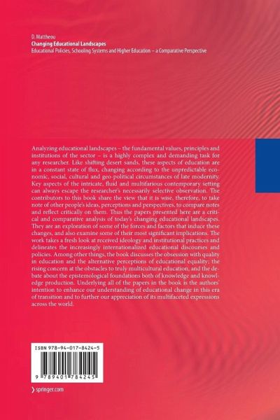 Analyzing educational landscapes - the fundamental values, principles and institutions of the sector - is a highly complex and demanding task for any researcher. Like shifting desert sands, these aspects of education are in a constant state of flux, changing according to the unpredictable economic, social, cultural and geo-political circumstances of late modernity. Key aspects of the intricate, fluid and multifarious contemporary setting can always escape the researcher's necessarily selective observation. The contributors to this book share the view that it is wise, therefore, to take note of other people's ideas, perceptions and perspectives, to compare notes and reflect critically on them. Thus the papers presented here are a critical and comparative analysis of today's changing educational landscapes. They are an exploration of some of the forces and factors that induce these changes, and also examine some of their most significant implications. The work takes a fresh look at received ideology and institutional practices and delineates the increasingly internationalized educational discourses and policies. Among other things, the book discusses the obsession with quality in education and the alternative perceptions of educational equality; the rising concern at the obstacles to truly multicultural education, and the debate about the epistemological foundations both of knowledge and knowledge production. Underlying all of the papers in the book is the authors' intention to enhance our understanding of educational change in this era of transition and to further our appreciation of its multifaceted expressions across the world.