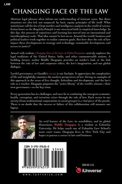 Abstruse legal phrases often inform our understanding of intricate cases. But those situations are also led, not outpaced, by basic equity principles of life itself. What statisticians call the law of large numbers and intelligence analysts in the world of science fiction know as the Bergofsky Principle is our structural faith in empirical knowledge. In this day, this process of experience and learning has moved into an international and interdisciplinary scale. That idea cannot be lost on us. Around the world, business and political leaders work together to realize common goals. But how does the rule of law impact these developments in strategy and technology, sustainable development, and access to justice? Armed with realism, Changing Face of the Law: A Global Perspective actively explores the legal traditions of the United States, India, and other commonwealth nations. A budding lawyer, author Riddhi Dasgupta provides an insider's look at the link between the rule of law and corporate ethics, the law's imagination, and our global dialogue. Lawful governance, or Gandhi's swaraj, is our linchpin. It appreciates the complexities of life and insightfully examines the modern perspectives of law. Giving us examples of this approach in the areas of free thought, federalism and development, and the law's role as a teacher, Dasgupta pinpoints the 'active liberty" of the world's citizens-their own governance-as the key issue. Every generation has its challenges, and ours lie in combating the emergent economic, health, corruption, and terrorism crises through the rule of law. Each sector in our society (from multinational corporations to social groups) is a vital piece of the puzzle. There is no doubt that the success or failure of this collaboration will measure our legacy.