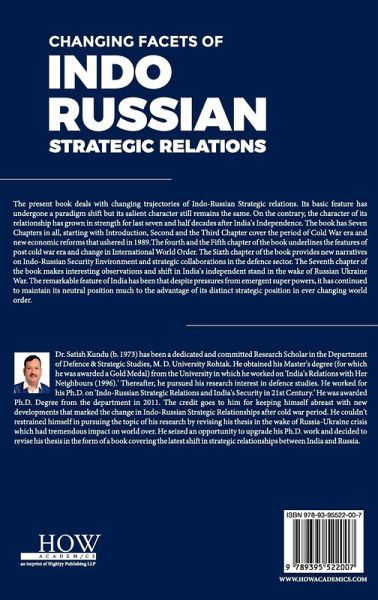 The present book deals with changing trajectories of Indo-Russian Strategic relations. Its basic feature has undergone a paradigm shift but its salient character still remains the same. On the contrary, the character of its relationship has grown in strength for last seven and half decades after India's Independence. The book has Seven Chapters in all, starting with Introduction, Second and the Third Chapter cover the period of Cold War era and new economic reforms that ushered in 1989. The fourth and the Fifth chapter of the book underlines the features of post cold war era and change in International World Order. The Sixth chapter of the book provides new narratives on Indo-Russian Security Environment and strategic collaborations in the defence sector. The Seventh chapter of the book makes interesting observations and shift in India's independent stand in the wake of Russian Ukraine War. The remarkable feature of India has been that despite pressures from emergent super powers, it has continued to maintain its neutral position much to the advantage of its distinct strategic position in ever changing world order.