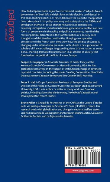 Figures Tables Notes on the Contributors Introduction: The Politics of Social Change in France; P.A.Hall PART ONE Capitalism, Coordination, and Economic Change: The French Political Economy since 1985; P.D.Culpepper New Patterns of Industrial Relations and Political Action since the 1980s; M.Lallement The Transformation of Corporate Governance in France; M.Goyer PART TWO The Long Good Bye to Bismarck? Changes in the French Welfare State; B.Palier Different Nation, Same Nationhood: The Challenges of Immigrant Policy; V.Guiraudon Social Generations, Life Changes and Welfare Regime Sustainability; L.Chauvel PART THREE The Government of the European Union and a Changing France; A.Smith The Ongoing March of Decentralization within the Post Jacobin State; P.Le Galès PART FOUR The French Party System and the Crisis of Representation; G.Grunberg Convergence, Fragmentation and Majority-Cycling in French Opinion; R.Balme