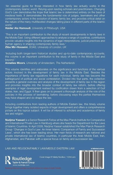 Preface; Introduction: new family law codes in Middle Eastern countries: reforms that are faithful to Islamic tradition?, Marie-Claire Foblets. Part I Breaks and Continuities in Middle Eastern Law: Breaks and continuities in Middle Eastern law: women after the 2011 revolutions, Chibli Mallat; Contextualizing family-law reform and plural legalities in postcolonial Pakistan, Shaheen Sardar Ali; Family law, fundamental human rights and political transition in Tunisia, Monia Ben Jemia. Part II Legislation: Struggling for a modern family law: a Khaleeji perspective, Lena-Maria Möller; Between procedure and substance: a review of law-making in Egypt, Nora Alim and Nadjma Yassari; The financial relationship between spouses under Iranian law: a never-ending story of guilt and atonement?, Nadjma Yassari. Part III Judiciary: Les pouvoirs du juge tunisien en droit de la famille, Salma Abida; Divorce in Egypt: between law in the books and law in action, Nathalie Bernard-Maugiron; Personal status law in Israel: disputes between religious and secular courts, Imen Gallala-Arndt. Part IV Party Autonomy: Marriage contracts in Islamic