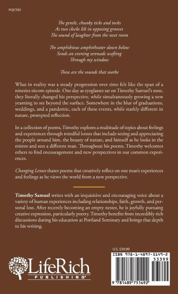 The gentle, chunky ticks and tocks As two clocks lilt in opposing grooves The sound of laughter from the next room The amphibious amphitheater down below Sends an evening serenade wafting Through my window These are the sounds that soothe What in reality was a steady progression over time felt like the span of a nineties sitcom episode. One day as eyeglasses sat on Timothy Samuel's nose, they literally changed his perspective, while simultaneously growing a new yearning to see beyond the surface. Somewhere in the blur of graduations, weddings, and a pandemic, each of these events, while starkly different in nature, prompted reflection. In a collection of poems, Timothy explores a multitude of topics about feelings and experiences through mindful lenses that include seeing and appreciating the people around him, the beauty of nature, and himself as he looks in the mirror and sees a different man. Throughout his poems, Timothy welcomes others to find encouragement and new perspectives in our common experiences. Changing Lenses shares poems that creatively reflect on one man's experiences and feelings as he views the world from a new perspective.