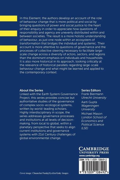 In this Element, the authors develop an account of the role of behaviour change that is more political and social by bringing questions of power and social justice to the heart of their enquiry in order to appreciate how questions of responsibility and agency are unevenly distributed within and between societies.