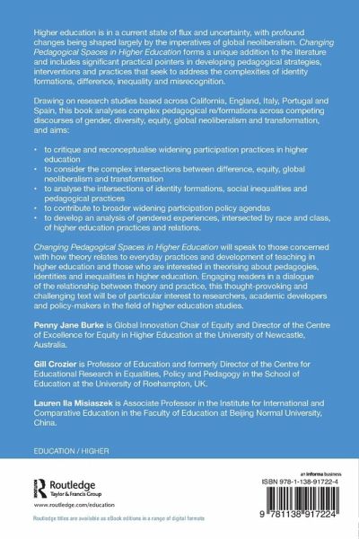 Higher education is in a current state of flux and uncertainty, with profound changes being shaped largely by the imperatives of global neoliberalism. Changing Pedagogical Spaces in Higher Education forms a unique addition to the literature and includes significant practical pointers in developing pedagogical strategies, interventions and practices that seek to address the complexities of identity formations, difference, inequality and misrecognition. Drawing on research studies based across California, England, Italy, Portugal and Spain, this book analyses complex pedagogical re/formations across competing discourses of gender, diversity, equity, global neoliberalism and transformation, and aims: to critique and reconceptualise widening participation practices in higher education to consider the complex intersections between difference, equity, global neoliberalism and transformation to analyse the intersections of identity formations, social inequalities and pedagogical practices to contribute to broader widening participation policy agendas to develop an analysis of gendered experiences, intersected by race and class, of higher education practices and relations. Changing Pedagogical Spaces in Higher Education will speak to those concerned with how theory relates to everyday practices and development of teaching in higher education and those who are interested in theorising about pedagogies, identities and inequalities in higher education. Engaging readers in a dialogue of the relationship between theory and practice, this thought-provoking and challenging text will be of particular interest to researchers, academic developers and policy-makers in the field of higher education studies.