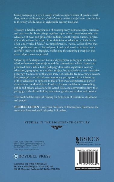 Using pedagogy as a lens through which to explore issues of gender, social class, power and hegemony, Cohen's study makes a major new contribution to the study of education in eighteenth-century England. Through a detailed examination of contemporary methodologies, curricula, and practices this book brings together topics often treated separately: the education of boys and girls of the middling and the upper classes. Further, this study widens the scope of our definition of education to include the often-under-valued field of "accomplishments". Indeed, Cohen shows that accomplishments were a formal part of male and female education, with carefully theorised pedagogies, challenging the enduring perception that these subjects were superficial. Subject specific chapters on Latin and geography pedagogies examine the relations between these subjects and the competitions which shaped and produced them. While Latin pedagogy dominated eighteenth-century education, geography, as a modern subject, had to develop a new normative pedagogy. Cohen shows that girls were not excluded from learning a science like geography, and that the contemporary perception of the inferiority of their education as opposed to that of boys was constructed as part of the classic vs. modern debate. Further, chapters on debates surrounding public and private education, the Grand Tour, and conversation show that pedagogy is the thread linking education, gender, social class and politics. This book will be essential reading for historians of education, childhood and gender.