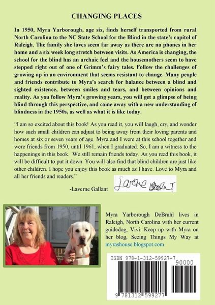 In 1950, Myra Yarborough, age six, finds herself transported from rural North Carolina to the NC State School for the Blind in the state's capitol of Raleigh. The family she loves seem far away as there are no phones in her home and a six week long stretch between visits. As America is changing, the school for the blind has an archaic feel and the housemothers seem to have stepped right out of one of Grimm's fairy tales. Follow the challenges of growing up in an environment that seems resistant to change. Many people and friends contribute to Myra's search for balance between a blind and sighted existence, between smiles and tears, and between opinions and reality. As you follow Myra's growing years, you will get a glimpse of being blind through this perspective, and come away with a new understanding of blindness in the 1950s, as well as what it is like today.