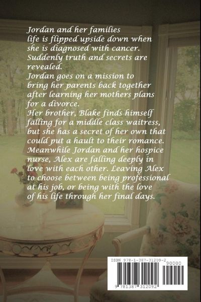 LARGE BOOK Jordan and her families life flipped upside down when Jordan is diagnosed with cancer. Suddenly truth and secrets are revealed. Jordan goes on a mission to bring her parents back together, after learning her mothers plans for a divorce. Her brother, Blake falls in love with a waitress who he confides in, but she has a secret of her own that could put a hault to their romance. Meanwhile, Jordan and her hospice nurse, Alex are falling in love with each other. Leaving Alex to choose between being professional at his job, or being with the love of his life through her final days.