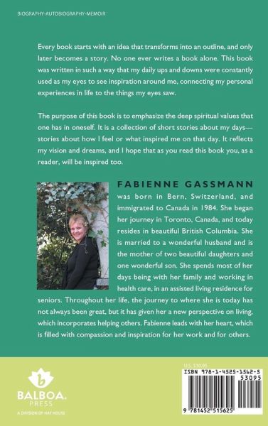 Every book starts with an idea that transforms into an outline, and only later becomes a story. No one ever writes a book alone. This book was written in such a way that my daily ups and downs were constantly used as my eyes to see inspiration around me, connecting my personal experiences in life to the things my eyes saw. The purpose of this book is to emphasize the deep spiritual values that one has in oneself. It is a collection of short stories about my days—stories about how I feel or what inspired me on that day. It reflects my vision and dreams, and I hope that as you read this book you, as a reader, will be inspired too.