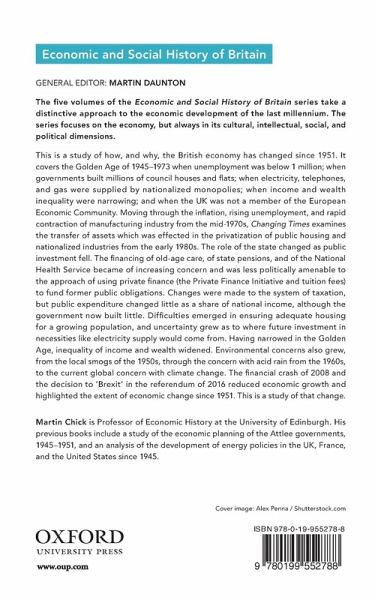 This is a study of how, and why, the British economy has changed since 1951. It covers the Golden Age of 1945-1973 when unemployment was below one million; when governments built millions of council houses and flats; when electricity, telephones, and gas were supplied by nationalised monopolies; when income and wealth inequality were narrowing; and when the UK was not a member of the European Economic Community. Moving through the inflation, rising unemployment, and rapid contraction of the manufacturing industry from the mid- 1970s, Changing Times examines the transfer of assets which was effected in the privatisation of public housing and nationalised industries from the early 1980s. The role of the State changed as public investment fell. The financing of old-age care, of state pensions, and of the National Health Service became of increasing concern and were less politically amenable to the approach of using private finance (the Private Finance Initiative and tuition fees) to fund former public obligations. Changes were made to the system of taxation, but public expenditure changed little as a share of national income, although the government now built little. Difficulties emerged in ensuring adequate housing for a growing population, and uncertainty grew as to where future investment in necessities like electricity supply would come from. Having narrowed in the Golden Age, inequality of income and wealth widened. Environmental concerns also grew, from the local smogs of the 1950s, through the concern with acid rain from the 1960s, to the current global concern with climate change. The financial crash of 2008 and the decision to 'Brexit' in the referendum of 2016 reduced economic growth and highlighted the extent of economic change since 1951. This is a study of that change.