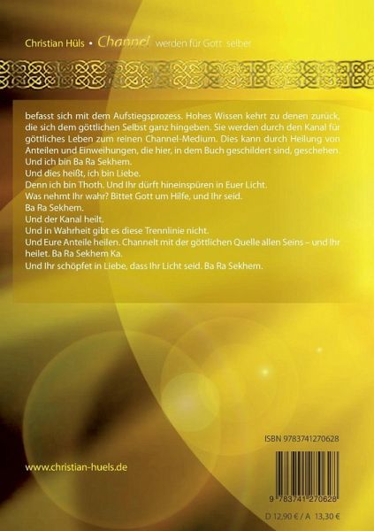 Channel werden für Gott selber befasst sich mit dem Aufstiegsprozess. Hohes Wissen kehrt zu denen zurück, die sich dem göttlichen Selbst ganz hingeben. Sie werden durch den Kanal für göttliches Leben zum reinen Channel-Medium. Dies kann durch Heilung von Anteilen und Einweihungen, die hier in dem Buch geschildert sind, geschehen. Und ich bin Ba Ra Sekhem.Und dies heißt, ich bin Liebe. Denn ich bin Thoth. Und Ihr dürft hineinspüren in Euer Licht. Was nehmt Ihr wahr? Bittet Gott um Hilfe, und Ihr seid.Ba Ra Sekhem.Und der Kanal heilt. Und in Wahrheit gibt es diese Trennlinie nicht. Und Eure Anteile heilen. Channelt mit der göttlichen Quelle allen Seins - und Ihr heilet. Ba Ra Sekhem Ka. Und Ihr schöpfet in Liebe, dass Ihr Licht seid. Ba Ra Sekhem.