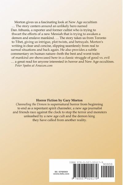 Channeling the Demon is a novel of occult action and supernatural horror from beginning to end. A demon king from another reality uses a spirit channeler and the priests of a world wide occult church to prepare the way for a new planet of evil. The book flies from one scene of terror to the next as the forces of good and evil clash, headed for the ultimate climax.