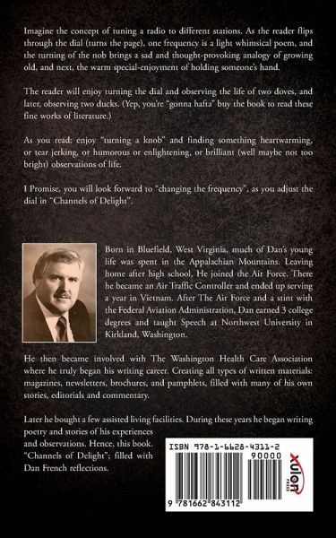 Imagine the concept of tuning a radio to different stations. As the reader flips through the dial (turns the page), one frequency is a light whimsical poem, and the turning of the nob brings a sad and thought-provoking analogy of growing old, and next, the warm special-enjoyment of holding someone's hand. The reader will enjoy turning the dial and observing the life of two doves, and later, observing two ducks. (Yep, you're "gonna hafta" buy the book to read these fine works of literature.) As you read; enjoy "turning a knob" and finding something heartwarming, or tear jerking, or humorous or enlightening, or brilliant (well maybe not too bright) observations of life. I Promise, you will look forward to "changing the frequency", as you adjust the dial in "Channels of Delight". Born in Bluefield, West Virginia, much of Dan's young life was spent in the Appalachian Mountains. Leaving home after high school, He joined the Air Force. There he became an Air Traffic Controller and ended up serving a year in Vietnam. After The Air Force and a stint with the Federal Aviation Administration, Dan earned 3 college degrees and taught Speech at Northwest University in Kirkland, Washington. He then became involved with The Washington Health Care Association where he truly began his writing career. Creating all types of written materials: magazines, newsletters, brochures, and pamphlets, filled with many of his own stories, editorials and commentary. Later he bought a few assisted living facilities. During these years he began writing poetry and stories of his experiences and observations. Hence, this book. "Channels of Delight"; filled with Dan French reflections.