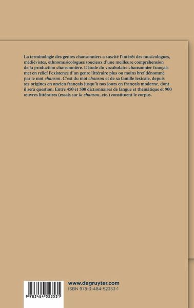 La terminologie des genres chansonniers a suscité l'intérêt des musicologues, médiévistes, ethnomusicologues et bibliographes soucieux d'une meilleure compréhension de la production chansonnière. L'étude du vocabulaire chansonnier français met en relief l'existence d'un genre littéraire plus ou moins bref dénommé par le mot chanson. C'est du mot chanson et de sa famille lexicale, depuis ses origines en ancien français jusqu'à nos jours en français moderne, dont il sera question.