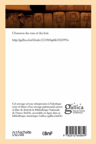 Chansons des rues et des bois Date de l'édition originale: 1867 Le présent ouvrage s'inscrit dans une politique de conservation patrimoniale des ouvrages de la littérature Française mise en place avec la BNF. HACHETTE LIVRE et la BNF proposent ainsi un catalogue de titres indisponibles, la BNF ayant numérisé ces oeuvres et HACHETTE LIVRE les imprimant à la demande. Certains de ces ouvrages reflètent des courants de pensée caractéristiques de leur époque, mais qui seraient aujourd'hui jugés condamnables. Ils n'en appartiennent pas moins à l'histoire des idées en France et sont susceptibles de présenter un intérêt scientifique ou historique. Le sens de notre démarche éditoriale consiste ainsi à permettre l'accès à ces oeuvres sans pour autant que nous en cautionnions en aucune façon le contenu. Pour plus d'informations, rendez-vous sur www.hachettebnf.fr