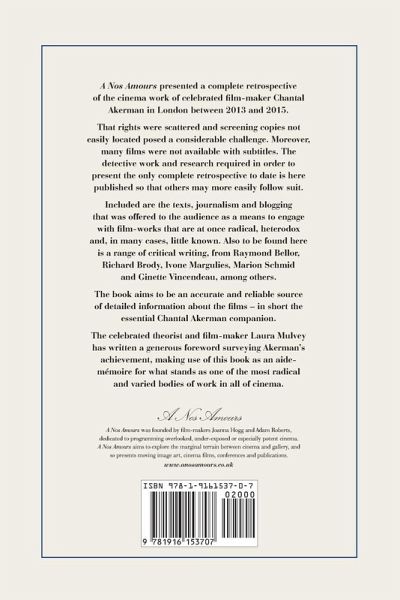 Between 2013 and 2015, A Nos Amours presented in London a complete retrospective of the films of the celebrated film-maker Chantal Akerman, the only complete retrospective given to date. Rights and screening copies turn out to be widely scattered and incredibly difficult to access. The research needed to present this retrospective is offered in this book so that others may more easily follow suit. Also included are the texts, journalism and blogging that was offered to the audience as a means to engage with film-works that are at once radical, wildly varied in style and content, and surprisingly often, on account of their rarity, little known. The book aims to be accurate and a reliable source of detailed information about the films. The book is intended to serve as an Akerman companion and a key reference work. Many texts are included to provide invaluable insights, from the likes of Raymond Bellour, Richard Brody, Ivone Margulies, Marion Schmid and Ginette Vincendeau. Laura Mulvey (whose phrase 'the male gaze' has revolutionised film theory) has written the foreword, surveying Akerman's achievement, making use of this book as an aide-mémoire for what stands as one of the astonishing bodies of work in all cinema: "As a collage of writing of many different kinds, the Handbook crucially bears witness to the effect that Akerman has had on the film community, from her earliest movies until her last... The high quality of the texts included in the book are all a reminder of the way that her ‘cinematic’ qualities have advanced our understanding of film." A Nos Amours was founded in London by Joanna Hogg and Adam Roberts, to present screenings, events and art shows.