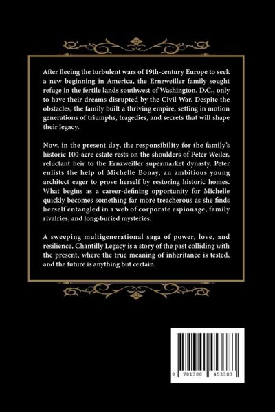 After fleeing the turbulent wars of 19th-century Europe to seek a new beginning in America, the Ernzweiller family sought refuge in the fertile lands southwest of Washington, D.C., only to have their dreams disrupted by the Civil War. Despite the obstacles, the family built a thriving empire, setting in motion generations of triumphs, tragedies, and secrets that will shape their legacy. Now, in the present day, the responsibility for the family's historic 100-acre estate rests on the shoulders of Peter Weiler, reluctant heir to the Ernzweiller supermarket dynasty. Peter enlists the help of Michelle Bonay, an ambitious young architect eager to prove herself by restoring historic homes. What begins as a career-defining opportunity for Michelle quickly becomes something far more treacherous as she finds herself entangled in a web of corporate espionage, family rivalries, and long-buried mysteries. A sweeping multigenerational saga of power, love, and resilience, Chantilly Legacy is a story of the past colliding with the present, where the true meaning of inheritance is tested, and the future is anything but certain.
